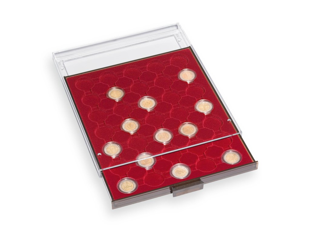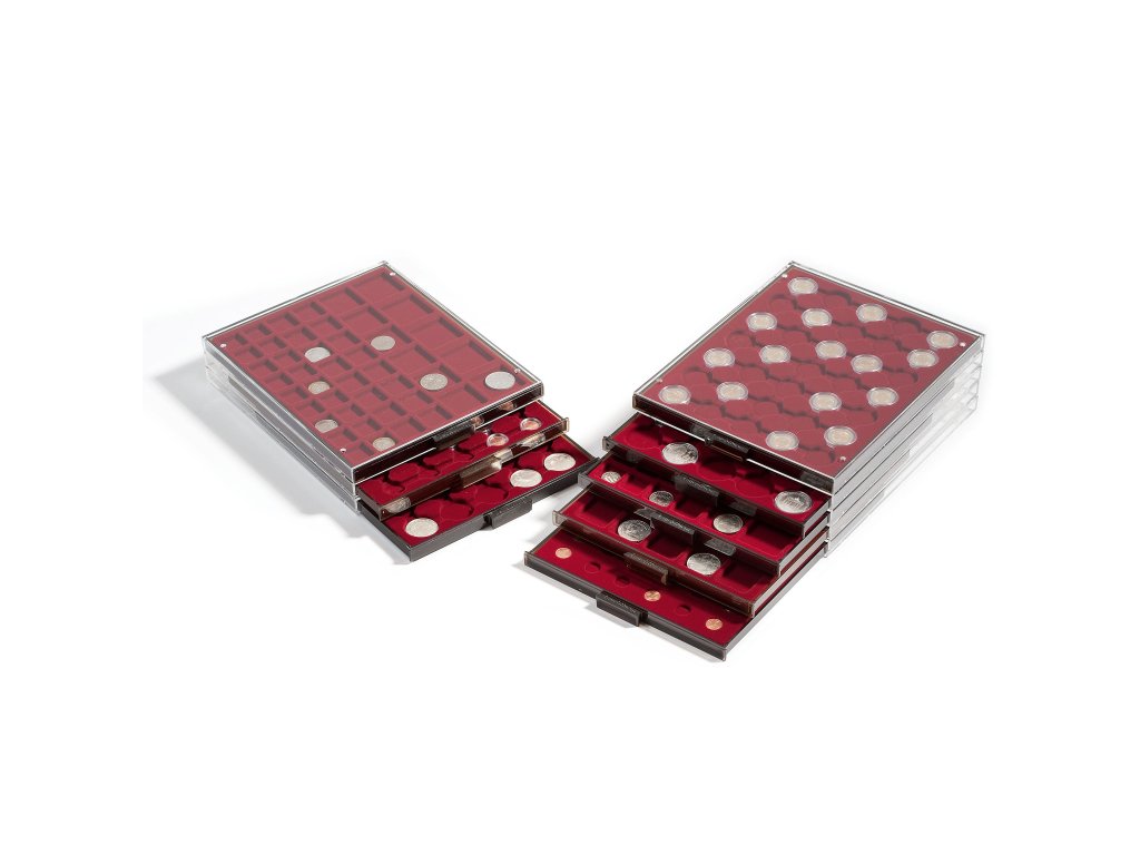 Přihrádky pro kapsle na mince LEUCHTTURM poskytuje pro mince dvojitou ochranu. Prostupy umožňují snadné vyjmutí kapslí na mince. Boxy na mince lze podle potřeby rozšířit, jsou stohovatelné a opatřené sametovými vložkami.