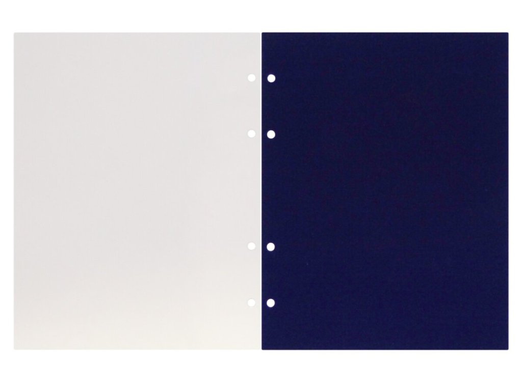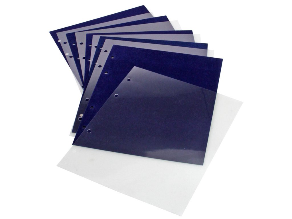 Tvarově stálé listy, královsky modře flokované. Včetně průhledných mezilistů.