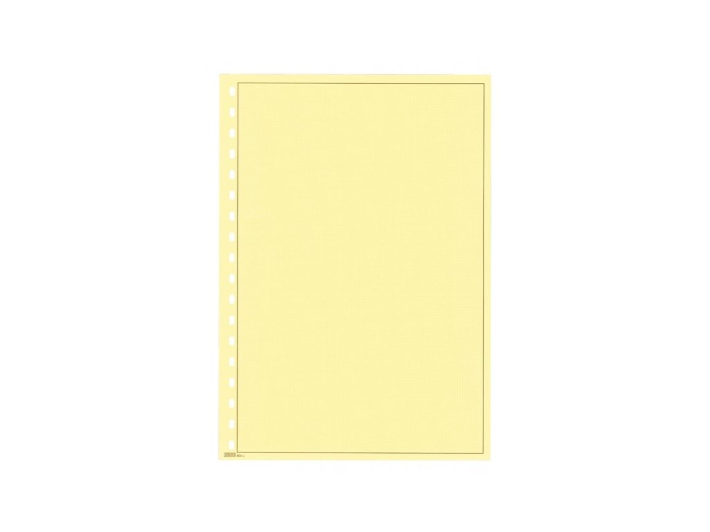 Žlutý albový karton (160 g/m²) s natištěným hnědým rámečkem (285 × 190 mm) a podtiskem s jemnou mřížkou.