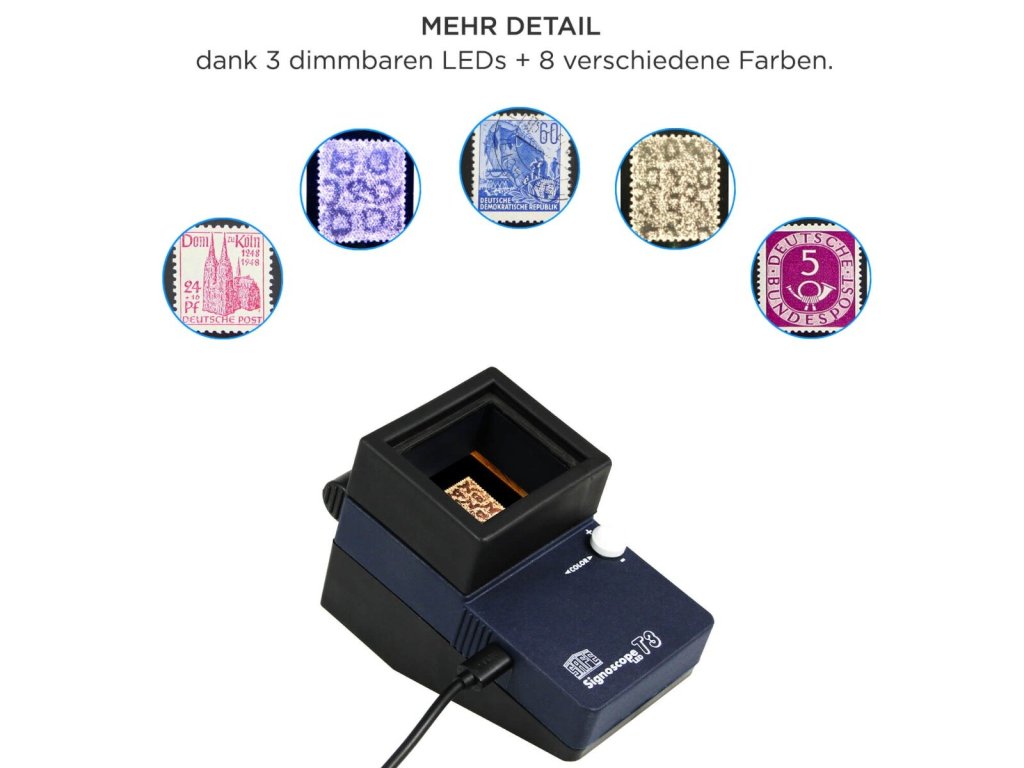 Nové Signoscope T3 je nyní výkonnější než kdy dříve – používá tři silné LED diody, které jsou odolné vůči opotřebení a velmi úsporné. Zajišťují dokonale rovnoměrné nasvícení zkoumané známky.
