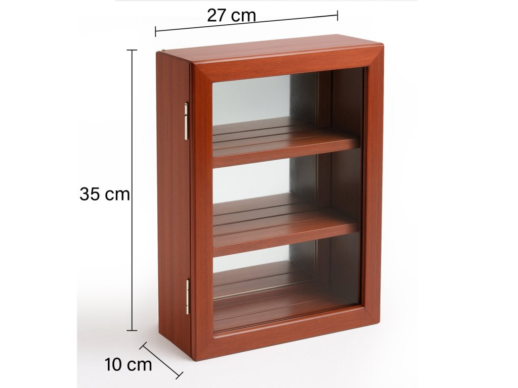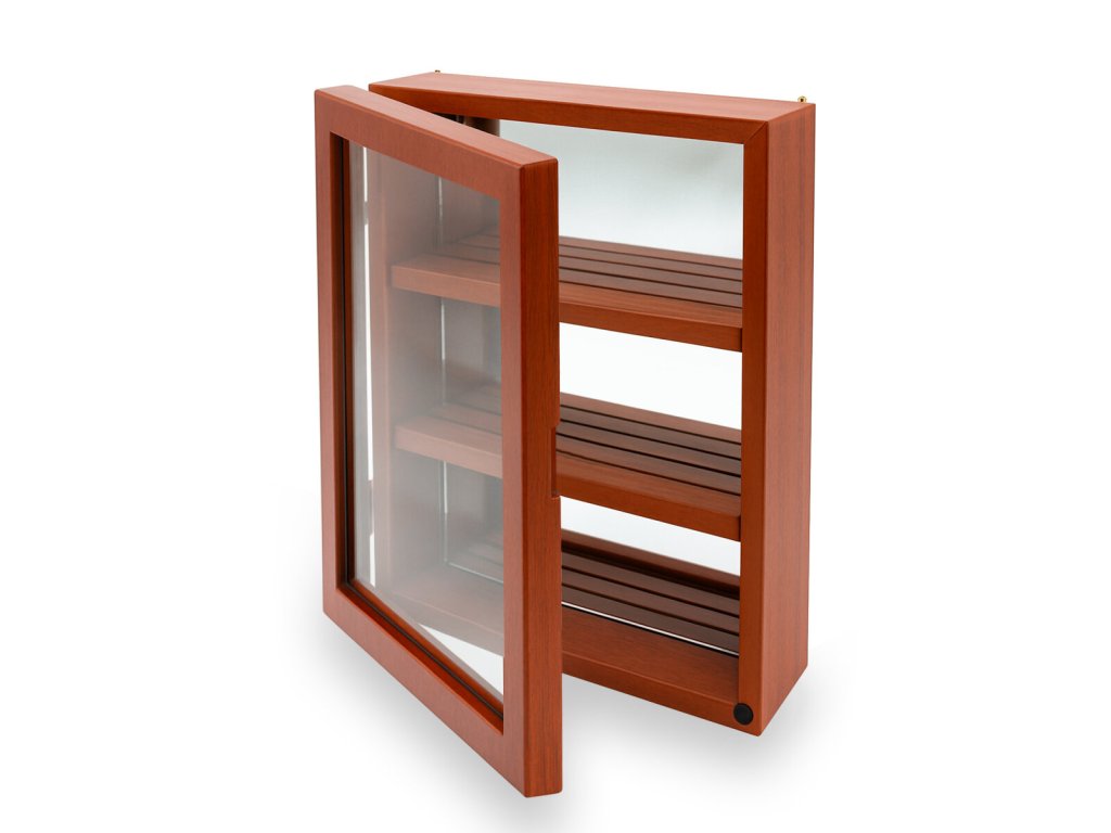 Vitrínu lze díky závěsným očkům na zadní straně snadno upevnit na zeď. Dvířka jsou opatřena pevným závěsem na levé straně a pravým sklem. Pevně zabudovaná zrcadlová zadní stěna dodává vystaveným předmětům hloubku a umožňuje jejich prohlížení i ze zadní strany.