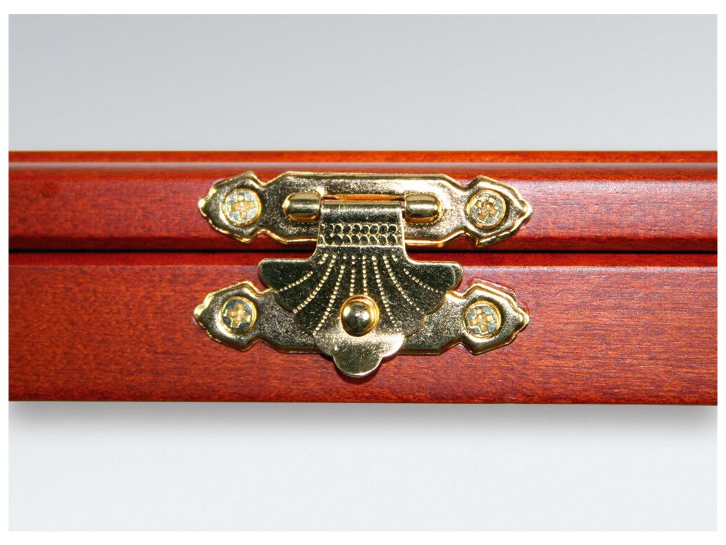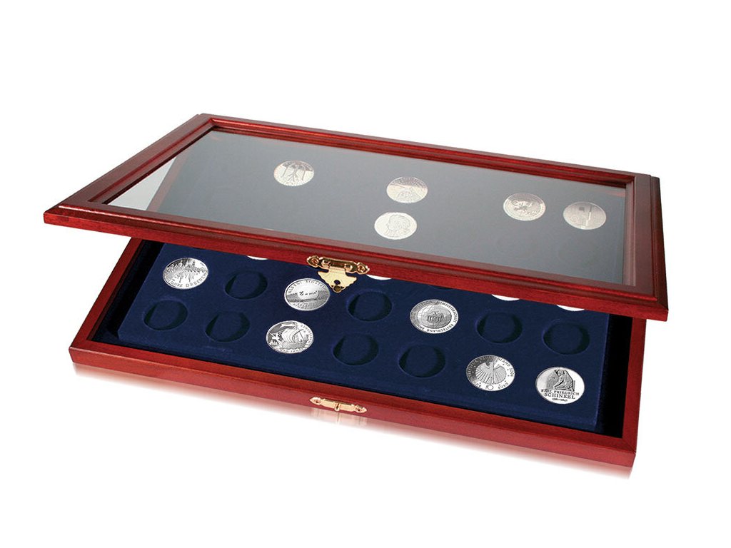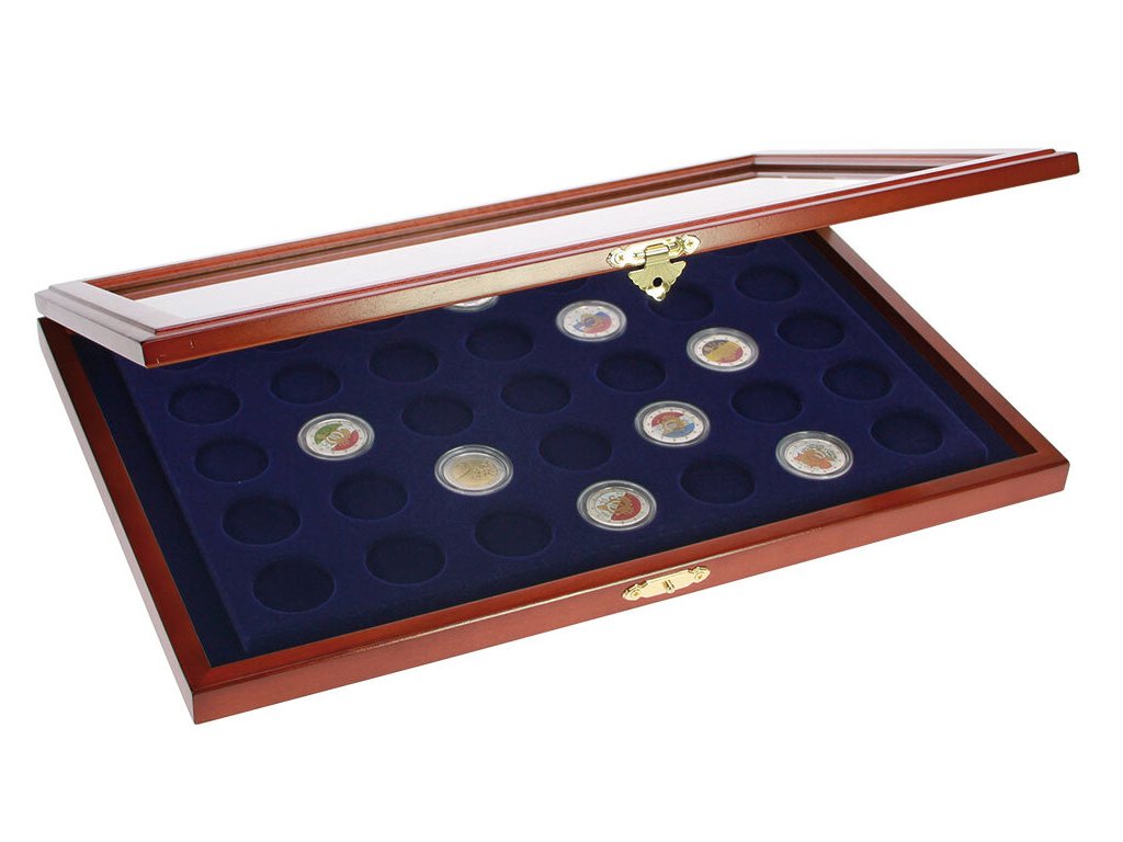 Vitríny jsou vyrobeny z kvalitního dřeva, osazené skleněným víkem a robustními kovovými prvky. Modrá sametová vložka s přesnými kulatými prohlubněmi zajišťuje atraktivní prezentaci i spolehlivé uložení mincí, a to jak volně, tak v bublinkách.