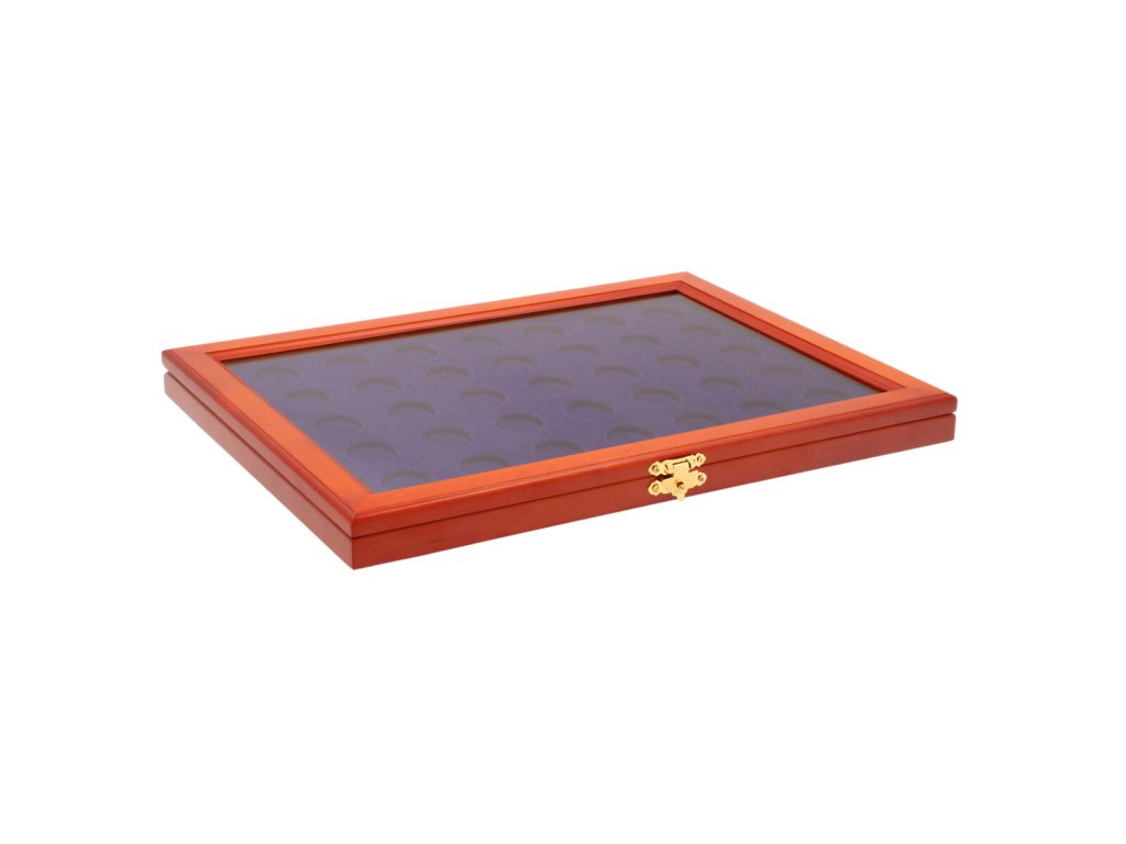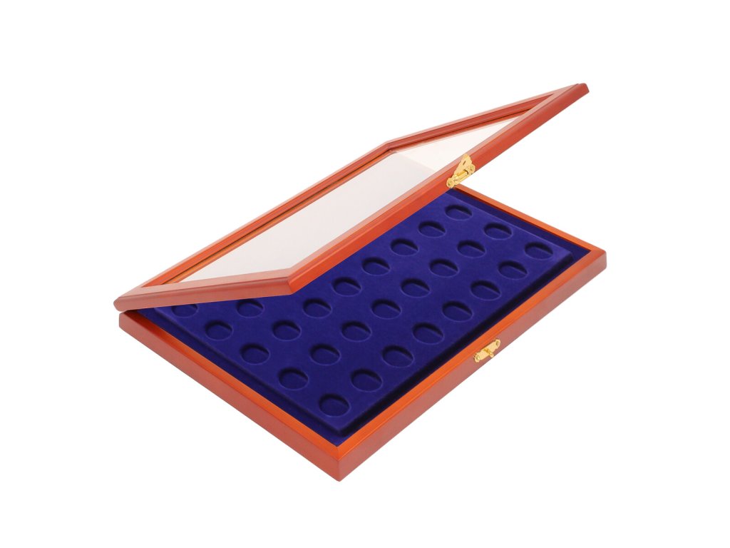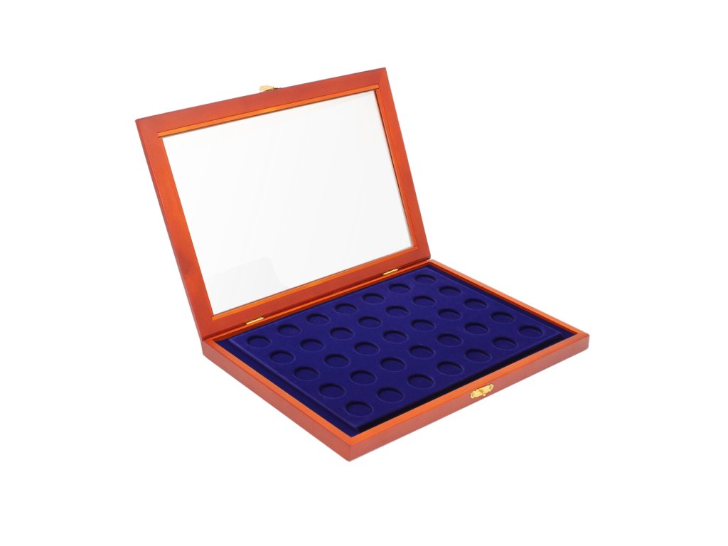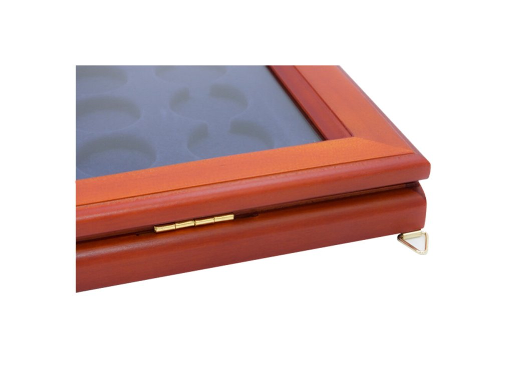 SAFE vitríny na mince jsou precizně vyrobeny z masivního ušlechtilého dřeva (bez dýhy) a zpracované na pokos pro nejvyšší kvalitu a odolnost. Díky kombinaci dřevěného rámu, skleněného víka a královsky modré sametové vložky nabízejí reprezentativní a bezpečné uložení pro sběratelské mince i mince v kapslích.