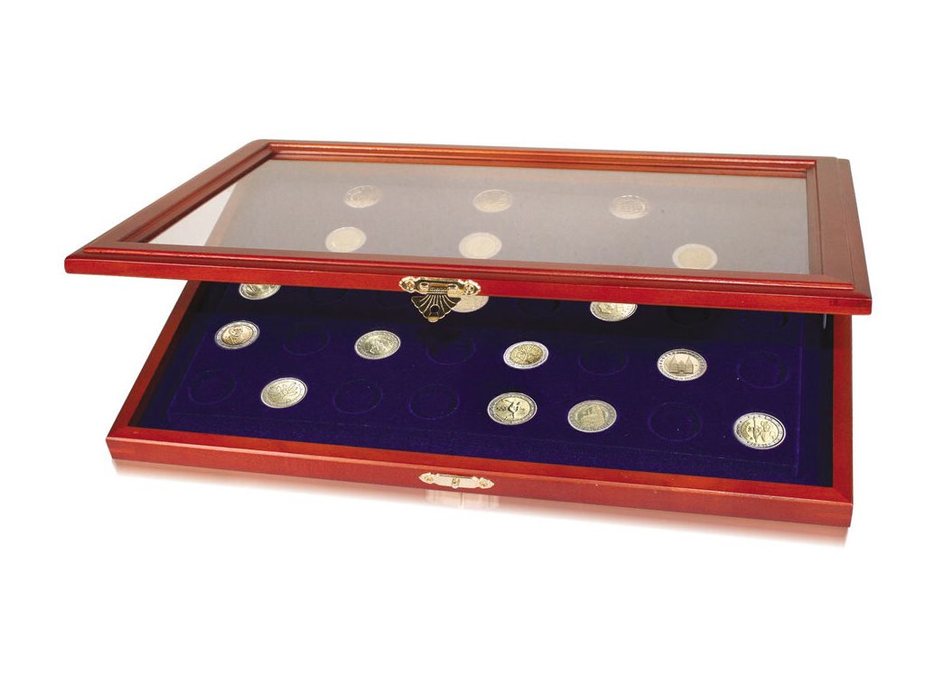Uvedené mm hodnoty udávají maximální velikost (průměr) kulatých prohlubní. Vitríny jsou vhodné jak pro mince v kapslích, tak pro mince bez kapslí.