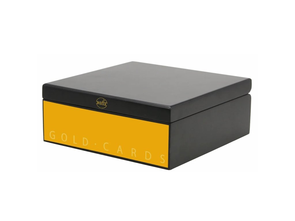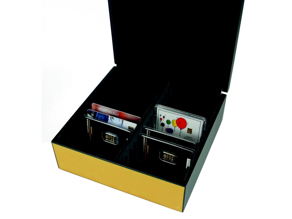 Přední strana je lakována ve zlaté barvě, která ladí se sběratelským obsahem. Box je rozdělen do 24 přihrádek, přičemž každá přihrádka pojme až 3 zlaté slitky v blistrech. Celková kapacita tak činí až 72 karet.